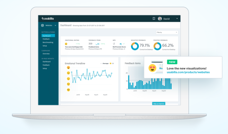Usabilla is a tool for capturing user feedback on websites, in apps or via email. On websites, feedback can be requested with a permanently visible Ô feedbackÕ tab on the side of the page, or through in-page requests using emojis, thumbs-up / thumbs-down and star rating scales. Feedback in apps is fully native with no need for redirects or triggering a browser window; in email, rating scales are e